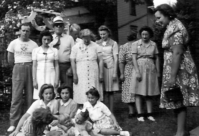 Back Row: Elmer, Willard, Rose, Barbara, Evelyn Krumbach, Pat Krumbach, and unknown woman. Seated: Alvin's adopted daughter Eleanor Krouse, Ruth Krombach, and Roseann Armbrust. The children in the foreground are unnknown.