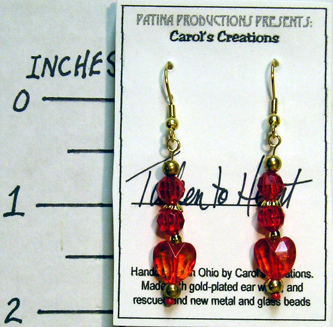 Made with lightweight red heart-shaped beads and faceted red beads. Hung on gold-plated ear wires. Sterling silver ear wires available upon request.