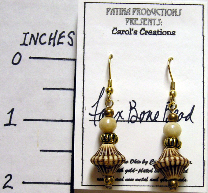 Made with faux bone beads, bone beads, glass opaque drop and gold antiqued pewter beads. Hung on gold-plated ear wires.