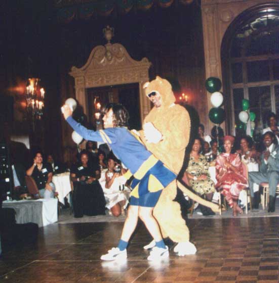 Karen Green Taylor leads a cheer with Eric Wilson as the Mascot.