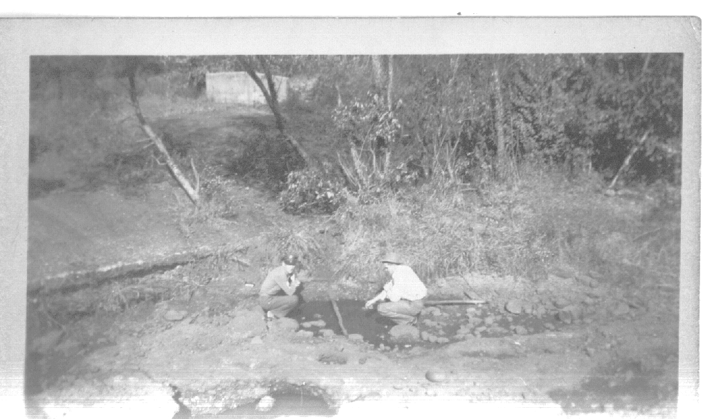 This picture was taken at Avon Pond North of De Queen. The man in the uniform is H. M. Craig. Other man is Thomas "Tommy" Jones. The picture was taken in 1945 or 46.