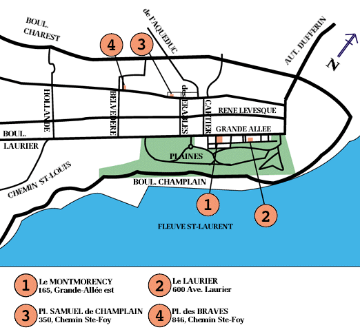Ici vous avez une idée d'où je suis située dans la ville. Je m'excuse de devoir utiliser cette carte-ci, ne vous occupez-pas des numéros, ils indiquent des hôtels que je ne connais pas moi-même (pourquoi coucherait-on à l'hôtel dans sa propre ville). J'avais essayé de la modifier en bitmap et d'encercler l'endroit où j'étais mais ça donnait trop de K et je ne pouvais la télécharger sur ce site. Dommage car j'avais fait une belle oeuvre!! Pour vous situer je me trouve vers en haut à droite sur la carte, tout près du croisement de l'Autoroute Dufferin-Montmorency et du Boulevard Charest (à gauche de Dufferin, en bas de Charest, un peu plus près de Charest que de Dufferin).