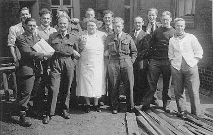 This and all photos of 1949 supplied by John Clegg.This photo outside Ma & Pa Raytons,top end of Wide Bargate on the way out to the Skegness/Spilsby Rd.Only names :- Paddy to left of Ma[her left] ? Taylor Mar/fitter,holding newspaper,Pete Craddock next to and just behind John Clegg,John Clegg in dark sweater behind guy in white jacket,Hector McCluskey on Ma's right{between her and Taylor}looking over Ma's shoulder,Eddie?,head between Taylor and Hector,{man's name not known}but believed to be of the chippy,Tony Forbes head turned behind Hector,two guys in white coats were the cooks.