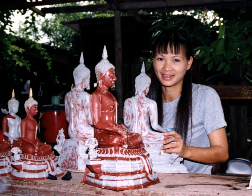 While in Phitsanulok, we visited the Buranathai Buddha Image Foundry. Buddha images of all sizes and shapes are made using the lost wax method. The girl above was painting the images.