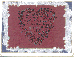 | Wedding Card I found a marriage stamp and stamped it in one of the wedding colors. Using decorative scissors, cut the edged. I then took a gold pilot pen and trimmed the edges, mounted it on a mulberry paper with the other color beneath it trimmed with the gold pilot pen. |
