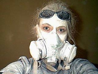 Damn, I've been busy. This entire week, I've been putting in 10 hour work days on my mothers kitchen. Last Saturday night, I got bored around 1am so I decided to get started. I washed down all of the walls and plastered nail holes. Mom woke up around 4 or 5 and I filled her in on my plans. Since my parents are hosting some big bbq party on the 7th, and all of their friends are coming from ALL over the states and Canada...I thought it would be nice to finally finish up the majority of our renovation. So I've been working nonstop (with and without help...most of it I've done by myself. Unfortunately, everyone else gets tired and bails on me) All hours of the morning I've been up scrubbing, sanding, painting, etc. It's been nasty back breaking work but....it's made mom happy. I like to make mom happy. She's been jipped for a long time. Sacrificing things that she wanted because of my brother and I...anyhow, enough of that mushy bullshit. It's pretty much done now. There's some last minute touch up painting to do. Hanging up all of her rooster and apple pictures and plates. (ya...all of that work for a "country kitchen" pukegagspew) Then it's on to the hallway. More scrubbing and sanding and painting and hanging of lighthouse nick-nacks. *sigh* But hell, like I said. It makes mom happy. And it's not my house. So I have no say in the decorating themes. One last thing on this topic...just a photo. This is what happens when Laura sands the ceiling. I had to wear this stupid mask...cause I inhaled a lot of the sanding dust. Ended up getting sick anyway. Fucked up my respiratory system...