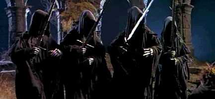 The wraiths turn and look at you. You see the pale glowing spots of their eyes deep within their black cowls. With a cold, shuddering moan, they begin to float towards you. They raise their bony hands and hellish swords, meaning to do unto you that which they have just done unto the others.