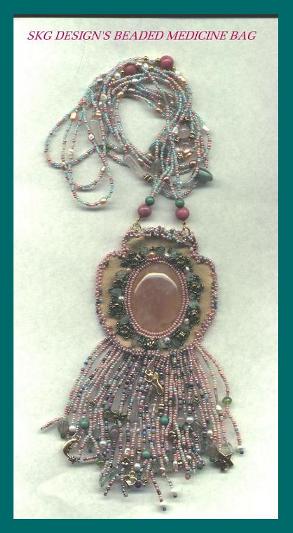 | Many hours go into creating these medicine bags,Rose Quartz medicine bag,featuring a beautiful Rose quartz cabochon,30x40mm.Semi Precious beads,chips,Seed Beads,Pearls.I can design something similar. |