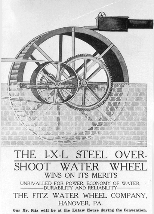 TOPIC: Advertising The Fitz Water Wheel Co. of Hanover, Pennsylvania, advertises, with a drawing of the I-X-L Steel Overshoot Water Wheel. Date (if known): unknown Photographer (if known): unknown Source (if known): John W. McGrain Location: Baltimore County Public Library, Towson, Maryland USA Reference number : Please reference this number when inquiring about a reproduction: 11162006 http://external.bcpl.lib.md.us/hcdo/cfdocs/photopage.cfm?id=3920 Notice: Where the water leaves the chute and enters the buckets of the water wheel. Please save as an image. It is larger than it appears on this page. Thank you.