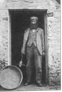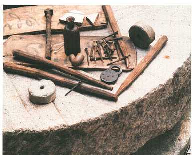 Mill picks and mill bills along with wooden handles called thrifts were used to dress the millstones. The millstone dressing tools are mentioned in another part of this web site so I won't discuss them in detail on this page. The miller or millstone dresser would always have a number of cut blocks, either 6 by 6, 8 by 8 and or 12 by 12, that were used to rest a millstone on when it was lifted off the millstone spindle. These blocks along with thin pieces of would were often stored underneath stairs. Many mills had a corner of the mill that was not used for machinery or storage, were a work bench could be found that hand a bench vice. The miller sometimes kept his hand tools there. Here the miller would punch holes in the ends of leather belts, he repaired tin and wooden elevator cups, and tried to keep his tools in one place. The miller would have a tact hammer to replace bolter screen and cloth, a regular hammer, screw driver, perhaps a Yankee screw driver, mallets, and other hand tools. Some place the grease bucket and paddle for greasing gears and cogs would be stored and kept, or perhaps in the gear pit were it was used. The proof staff and paint staff along with the trammel were usually kept near the millstones were they were regularly used and there was no need to carry them else were in the mill because they were used no where else. Sometimes the paint staff was hung on a beam near the millstones. The millstone dressing tools were often found laid on a cross beam of the framework of the building near the millstones or they could be hung from leather straps on a vertical post near the millstones or on the millstone crane.