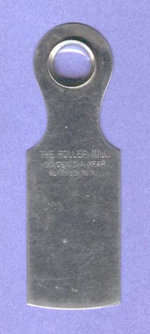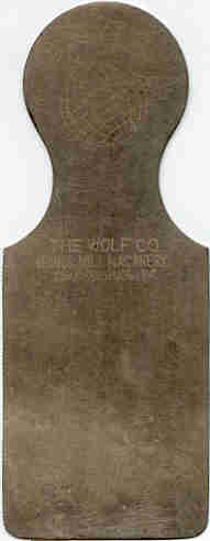 Every mill would have different types and sizes of paddles. There were ones used in flour and meal bins, bolter bottom hoppers, and in greasing gears and cogs. Flour machinery companies and others that sold only bolting cloth and screen passed out small (usually made of metal) hand held scrapers. They could be used in bolters for cleaning the screens, removing caked on build-ups, and for scraping down the reel surface clean when applying new bolting screen and webbing. Sometimes they are found with a small round magnifying glass (used to count opening in bolting screen) in the round hang up hold hole. Often when removed from the mill they would become sold as flour dough scrapers by mistake. That is not to say that flour milling companies did not hand out premiums with sacks of flour, but these pot, pan and work surface scrapers usually assumed different shapes and have more pronounced commercial labeling of the flour milling company rather than the supplier. There were also testing rings or small hand sifters that could hold a variety of different size mesh bolting screen or cloth.