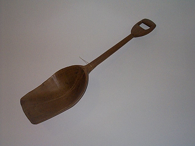 The millers also would have had grain shovels that were constructed out of a single piece of wood. I have a book that tells you how to carve and make wooden shovels that were used in mills and other industries like the storage of apples. They were cut and carved out of a single piece of wood. Originally all scoops, shovels, paddles and other items were made out of wood that came into contact with grain or flour. They believed for a long time that metal tainted the taste of flour. This superstition turned out to be a good thing because in this way there was no metal to strike the nail head and accidentally make a spark. In this way a superstition lessened the accidental chance of a dust explosion, that brought about hell fire and the end of everything in and about the mill. Sometimes these wooden scoops are found with metal patch repairs covering weak or cracked areas.