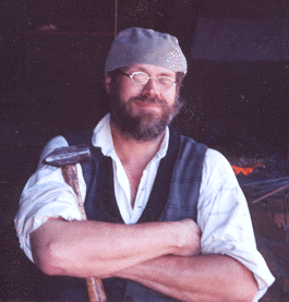 Introduction Good morning/good afternoon. I want to welcome you to the Blacksmith Shop. My name is Ted Hazen. I am currently the blacksmith at the Park. First of all I must mention that the work of the blacksmith can be dangerous. Please exert care and common sense while I am working for you and myself. The forge is very hot. Often when I strike the metal, sparks fly in all directions. The tools and the metal can remain hot for long periods of time. Please don't throw anything in the fire or water bucket. Does any one know what a blacksmith does? What does a blacksmith make? Why then is this place called a blacksmith shop? What is the Job of the Blacksmith? Well, it depends upon the time period and location of the blacksmith. In the 1700's when the apprenticeship program was still in effect in the trades, the blacksmiths specialized. A blacksmith might spend his six year as an apprentice learning how to make just one thing. A blacksmith might spend his six years learning how to make just nails, another blacksmith might learn how to make just hinges, door latches, and another blacksmith might learn how to make household fireplace items. So in a colonial town you might have a half a dozen different types of smiths. Some of them even working in different types of metal. Like the smiths who work in white metal are called silversmiths, and then there were also tin smiths. The blacksmiths worked in black iron or wrought iron. Wrought iron is the main material the blacksmiths used. The most common type of black iron the blacksmith used was nail rod. Cast iron is too brittle and would shatter when heated and struck with a hammer. Steel was rare and precious. They would only use steel to make flint strikers. When people moved into the frontier you were lucky enough to have one smith in town let alone a half a dozen different types of smiths. So when people spread out along the Great Wagon Road, the blacksmith had to become the jack-of-all-trades. Whatever had metal about it the blacksmith made, fixed or repaired. The blacksmith had to learn other trades which involved metal, like shoeing horses. Shoeing horses was the farrier's job. It was not uncommon to see signs hanging outside of the blacksmith shop advertising the different trades which the blacksmith took on such as horse shoeing, fixing wagons, making wagon wheels and even pulling teeth. How would you like to go to the blacksmith shop to have your teeth pulled? The Importance of Nails When people moved from Pennsylvania, New York or New Jersey down the Great Wagon Road, do you know one of the last things they did before they left? After they said goodbye to all of their friends and relatives, they burned down their houses and barns. Do you know why they did that? What is so valuable that they would burn down their houses and barns to sift out of the ashes to get? The nails, hinges, and hardware. The old nails would become the new nails for their new houses. Where they were going they were not sure they would find a blacksmith to make them new nails, so they would use their old nails. Nails were very expensive. When people traveled down the Great Wagon Road they would carry iron with them in the bed of their wagons. As they traveled down the wagon road their iron tires would stretch and slip off, or other iron parts might wear out. So if they were lucky enough to find a blacksmith he might not have the iron to do the job, so they carried iron to do the work and extra iron to barter or trade with the blacksmith for doing the work. In turn the blacksmith might make something from his iron and trade or barter with someone else. Like with the miller, the blacksmith might make an iron candle holder or mill part to get some flour. There's a folk saying going back to the 15th century, if not earlier, reminding us that a nail isn't any good if it isn't used.