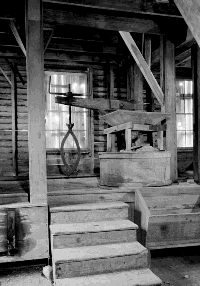 Second floor large flour bolting machine that occupies almost the entire second floor. The large bolter contains several bolting reels and a number of chutes underneath for the various grades of material sifted from the ground grain. To the right of the vertical support post in an elevator. The second floor of this mill is usually closed and not accessible to visitors.