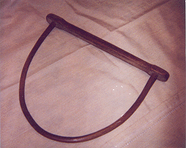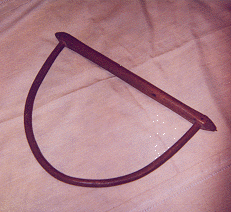 Dimensions: Sack or Bag Holder is made so a cloth flour sack will fit up through the center opening and them can be folded around the outside. The sack holder is then laid on two strips of wood sitting across the top of a wooden barrel. When full it can be tied shut and lifted out of the barrel. 1. Sack Holder- Hoop 1/2 inch in diameter. Hole centers in bar is 10 3/4 inches. From center of back of bar to the outside of hoop at largest point is 9 3/4 inches. The ends of the hoop is held in the bar with wooden pins (one on each end). Bar is 1/2 inches thick, 3/4 inches wide in center and 1 1/8 inches wide at ends, and 12 3/4 inches total bar length. 2. Sack Holder- Hoop 1/2 inch in diameter. Hole centers in bar is 11 3/4 inches. From center of back of bar to the outside of hoop at largest point is 8 3/4 inches. The ends of the hoop is held in the bar with square (actually they are rectangular) metal nails (one on each end). Bar is 5/8 inches thick, 3/4 inches wide the length of the bar and it tapers to a 1/4 inch round circle at the ends. Inside of this circle is a pointed spike that holds the cloth sack in place. The pointed spike is made out of a square piece of metal stock placed in s square hole. The total bar length of the bar is 13 3/4 inches.