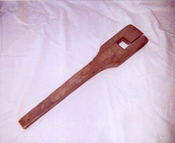 A wooden trammel for a 42 inch pair of millstones. Overall length is 24 1/8 inches. Width of feather quill end is 1 3/8 inches, 4 1/8 inches at millstone spindle end, and the length of that section is 7 1/4 inches until beginning of curve. Thickness at feather quill hole end is 5/8 inches, & thickness at millstone spindle end is 1 3/8 inches. Length from center of feather quill hole to center of millstone spindle hole is 19 inches. Millstone spindle opening is 1 7/8 inches wide by 2 inches long. Split must have occured with wedged tight onto millstone spindle. This is very common in most trammels is that they split. It should have been made out of a hard wood to prevent splitting. Names in pencil written on both sides of handle. Original repairs made to split with square nails, and two later modern round nails added. Surface has hatchet marks and has been hand planed. Wood is dry, appears to be a soft wood, and has some worm holes on the surface.