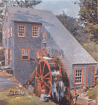 The Wayside Grist Mill, powered by a water wheel, is a reproduction built by the late Henry Ford (John Blake Campbell, and the Fitz Water Wheel Company) in South Sudbury, Massachusetts. Visitors may watch corn meal being ground for the nearby Wayside Inn, made famous by poet Henry Wadsworth Longfellow. Small water powers and water wheels that used them are as much a part of American history as the pony Express or the covered wagon. "The Industrial Revolution," John Fitz pointed out, "changed manufacturing from hand to machine work. It was powered mostly by water wheels." These wheels ground the pioneer's corn and wheat, sawed logs into boards, crushed apples into cider, made the country's first iron and the first mill-wrought fabrics, ground snuff, rolled hemp, made paper - the list of things done is a long gone. Along the Brandywine a century and a half ago, men name du Pont set up water-driven mills to grind gunpowder ingredients - and a modern industrial giant was born. Eli Terry, the Connecticut clock maker, boldly pioneered the use of water power to cut teeth in clock wheels - previously done tediously by hand - and set the pattern for the modern clock and watch industry. Cities grew up on water-power sites. An ancestor of John H. Patterson's ground grain brought in ox carts to his water-powered mill on the Miami River, in Ohio. A century later, peppery "John H." was creating the National Cash Register Company on almost the same spot, and Dayton was growing up around him into a city of 250,000. Small water in those days were used intensively. Sometimes a creek was dammed a dozen times within a mile, and the water was used again and again. A traveler of 1840 reported that eleven mills of various kinds were going full blast within the limits of little Piqua, Ohio, all powered by water from the canal and river. A Massachusetts miller cursed with insufficient water at certain seasons built three identical mills within a hundred yards of each other on the same stream, and during low water periods used the highest mill Mondays and Tuesdays, the middle one Wednesdays and Thursdays, the lowest Fridays and Saturdays. By Monday, enough water had accumulated for the highest mill, and the cycle was repeated. The power picture changed with the coming of efficient steam engines, internal combustion engines and electricity; and now, of course, there is talk of atomic and solar power engines. "People thinking in billions," Fitz points out, "find it hard to value small waters. Only the mightiest, wildest rivers, such as the Columbia, Colorado, Snake, Tennessee or Niagara, they suppose are worth harnessing." But something important, he thinks, is lost by overlooking the little streams and the new developments that are making their use feasible again. He said, "A steel overshoot wheel" - the type that takes the water at the top and is better for a good head of water - "properly designed and installed, is far different from the wooden water wheels which were the only ones our grandfathers had. Such a wheel can operate with upward of ninety percent efficiency. We have built wheels forty feet in diameter. You'd think it would take tremendous strength to turn such a wheel. Actually, we consider them faulty unless a child can turn them by hand." There have also be some extraordinary water-wheel developments. During the war, Fitz's company made 120 water wheels for the British Army. What would a modern army want with water wheels? The British, Fitz says, parachuted them from planes to points behind enemy lines or into liberated zones. They were as tiny as they could be made and still do the work expected of them - in fact, they measured barely four inches across. Each wheel, included an attached electric generator, weighted twelve and one half pounds. It was call an impulse wheel and the perfect little water wheel. "The first thing people do in a bombed out town," Fitz pointed out, "is restore the water supply. They have to, or die. Advance scouts usually found water in the mains of a ruined town or speedily got it there. These little impulse wheels can do things with a low flow. They are attached by a length of hose to any faucet. The water turns the wheel, the wheel operates the generator, producing electric current. We have tested the wheels at forty pounds' pressure, and they make 1800 revolutions per minute, producing enough electricity to keep three or four bulbs burning brightly. "We weren't told how the British used theirs. The job was hush-hush. We supposed they charged storage batteries for walkie-talkie communication or things like that. "Universities also use these impulse wheels. Their are usually larger. They use them in course on hydraulics. We have recently shipped wheels to the universities of Louisiana and California, to the Naval Academy, and to the engineering college of Dacca University, in East Pakistan." He explained what happened recently in Marietta, a Pennsylvania town of about 2,400 located on the banks of the Susquehanna River. A water shortage was brought on by the town's natural growth plus the location there of the Marietta Transportation Corps Depot. The town's water came from fifty-tow never failing springs on the far side of the river, located in up and down country almost inaccessible except by jeep. The springs lie somewhat higher than the town, so that the water flows by gravity through pipes on the bottom of the river. In order to increase the supply, two wells were drilled near the springs, but on a slightly lower level. The wells produced much of the wanted additional water. But a problem was posed. The springs flowed; the wells didn't. How to get the water out of the wells and into the town reservoir without keeping a pump tender at that lonely spot night and day? Two Fitz water wheels came to Marietta's rescue. Spring water, bubbling towards the town reservoir, powers the water wheels. The wheels, in turn, operate pumps which transfer the newly tapped water supply f