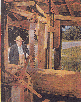 The pride and joy of Ernest Ballard, 84, is this rare, water-powered up and down sawmill he erected at his home in Derry, New Hampshire. Here and there, private individuals get into the museum act. Several decades ago Ernest K. Ballard used to ride the logs being sawed into boards on the neighbors' water-powered, up and down sawmill. He never forget the fun he had. He went into the market gardening at Lexington, Massachusetts, when he was fifteen, and stuck with it till he was past sixty. Then he began looking for a place to retire to, where he could build an up and down sawmill. He found the ideal spot in Island Pond Road in Derry, New Hampshire, where there had once been a sawmill. Ballard traveled far and near, getting facts, materials and equipment. Today he has one of the few up and down sawmills, with a water wheel and a saw resembling a logger's cross-cut saw, that can still saw logs by water power. At eighty-four he is hard of hearing and none too spry, but he will almost dance a jig if somebody asks to see a log sawed. As long as water runs downhill, John Fitz thinks, people will use the power of its fall. He has nothing against atoms. But he finds raindrops simpler.