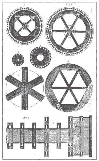 1 shaft, 18 feet long, 2 feet in diameter. 8 arms for the water wheel, 18 feet long, 3 by 9 inches. 16 shrouds, 8 1/2 feet long, 2 inches thick and 8 inches deep. 16 face boards, 8 feet long, 1 inch thick and 9 inches deep. 56 bucket boards, 2 feet 4 inches long and 17 inches wide. 140 feet of boards, for soaling the wheel.
