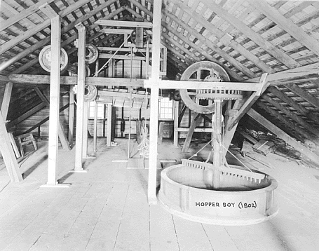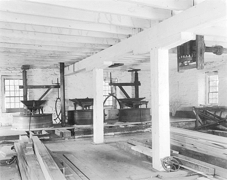 Notes (in pencil) from March, 1936 Fitz Water Wheel Companies photos. Fitz Water Wheel Company, Hanover, Pennsylvania. Photo 1: Pierce Mill - View of Grinding Floor. March, 1936 - Fitz Water Wheel Company. Photo 2: Pierce Mill - Friction Hoist for Operating Ancient Cast Elevator. Rolling Screen for Cleaning (and Smutter). Hopper Boy (1802). March, 1936 - Fitz Water Wheel Company. Photo 3: Pierce Mill during Restoration. Photo Submitted March, 1936 - Fitz Water Wheel Company. Photo 4: Pierce Mill. March, 1936 - Fitz Water Wheel Company. Sign (in photo): Federal Public Works, Project #571, Contract No. 1-IP-3961, Department of the Interior, National Park Service. Photo 5: Pierce Mill during Restoration. Photo Submitted March, 1936 - Fitz Water Wheel Company. Photo 6: Pierce Mill - View of Basement Floor Showing Husk Frame and Gear Pit with all Gearing, Shafting, etc. Bottle Weights, Crown Mortise Wheel and its two pinions and 16 inch diameter upright shaft and its Journal Boxes were all made in 1818. Meal Chutes made in 1840. March, 1936 - Fitz Water Wheel Company.