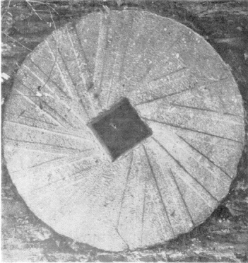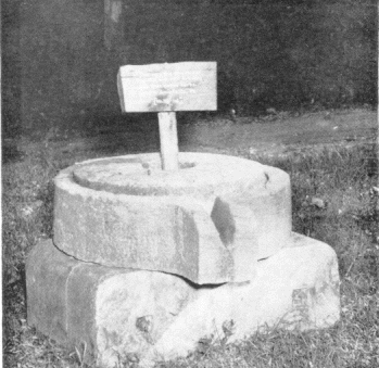Photo Number 3: A Typical Cocalico Bed Stone, around for grinding cob corn. The above description of cork stones was procured form the only source known to the writer. These stones were obtained through the courtesy of the Armstrong Cork Company of Lancaster, Pennsylvania, for the Martic Forge Collection. (6) Buckwheat Stones Because of the unusual construction and composition of the buckwheat grains, it required very light stones to do the work of grinding the grain. In fact, it had more of a "hulling" process. The stones were usually about three feet in diameter and about five or six inches thick. (7) The "dressing"was entirely different from the conventional wheat or corn stones. A very unique dressing is found on a pair of stones obtained from the former McCrabb Mill on Fishing Creek, Drumore Township (now at the Martic Forge Collection). The best way to describe this dressing is that it is boxlike or in squares. Another pair of buckwheat stones of flint composition, found at Frey's Mill, near Alinda, Spring Township, Perry County, have a very beautiful scroll-like dressing. Buckwheat stones were quite widely used in the early days of Lancaster County, especially in the northern section. Their use has long since become extinct. (8) Clover Seed Hullers These consisted of two stones, one convex and the other concave, because of the light weight of the material to be processed. The stones were of the under-runner type, i. e., the lower stone revolved while the upper stone remained stationary. To further facilitate the passage of the clover between the stones, the runner stone has coarse spirals from the "eye" to the "waist;" at the "skirt" of the stone were many corrugations which rolled or hulled the tiny seeds from the clover heads. The eye of the upper stone was necessarily much larger than a grain stone, usually from fifteen to eighteen inches in diameter. The author was never able to locate any stone clover seed hullers in Lancaster County. The pair in the Martic Forge Collection was located near Newport, in Perry County, Pennsylvania, from the estate of Jim Crow, who had collected two pairs. The other pair was obtained by the Landis Valley Museum. Both pairs are of red sandstone and present a very pleasing appearance. They are forty-five inches in diameter. Steel separators having entirely supplanted the stone clover seed hullers. Tannery Stones Tannery Stones were in the group of single stones, i. e., they worked "Solo." Most persons, when seeing a tannery stone, are apt to think it a big stone cog wheel for that is what it resembles; having large cog-like corrugations cut on the outside circumference. When in use these heavy stones were run in an upright position over the dry tan bark, which was spread on a corduroy like flooring where the bark was broken into fines pieces for use in the tanning vats. (9) Tannery stones varied in size from three to five feet in diameter, and from one foot to eighteen inches in thickness. The tannery stones at the Martic Forge Collection was found near a spring, lying in a clearing near Schoeneck. The oldest resident in the vicinity said it had been lying there all of his lifetime. But its history is unknown. Distillery and Hemp Stones In early Lancaster County history distilleries were very numerous. Before the start of the dairy industry and the fattening of steers on county farms, many farmers utilized their corn crop by setting up a still and converting their corn into whiskey. To prepare the corn for fermentation it had to be ground or crushed. (10) Distillery stones as used on farms were cone-shaped, usually about thirty inches high and thirty inches at the base of the stone, tapering to about twelve inches at the top. A hole about six inches in diameter was cut in the center of the stone, from base to top, for insertion of an oak shaft, which extended through the stone and was mortised to an upright shaft, which could revolve in a sprocket set in the center of a stone circle with a coping around the edges. This stone base was usually masoned; although there may have been a few single stone basins, i. e., a basin cut from a single rock. The distillery stone was run on its side with the base on outside of the basin and was revolved by horses, mules or oxen. Hemp stones were very similar to distillery stones and were operated on the same principle. However, instead of having a stone bed, a flooring of oak planking was used as the crushing floor. The object was to break the reed or stalk of the hemp plant, so that the coarse linen-like fiber could be "shaken" or separated from the reed or stalk. One of the hemp stones in the Martic Forge Collection was found at the location of what had been Eckman's Mill, on Mill Creek, near Lyndon, a few miles south of Lancaster. One of the distillery stones in the collection was obtained at the original Bausman farm, west of Millersville, in Manor Township. It is initialed presumably by the maker, and bears the date of 1752.