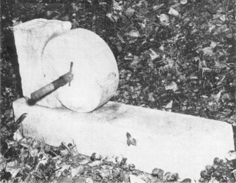 Photo Number 4: A set of Dye Stones, used to grind native herbs and berries for dye. From Juniata County, Pennsylvania. Dye Stones A set of dye stones in good preservation presents a very artistic and beautiful appearance, because of the pitcher-like shape of the base stone. (11) The runner stone was usually hand-operated which would indicate that the stones are not very large. The runner stone ranged from twelve inches to eighteen inches in diameter, and from four to six inches in thickness. These stones were usually smooth-faced and depended on the revolving action and weight of the runner stone to crush the plants or berries from which the dye was to be extracted. The "juice" or dye ran out the protruding spout of the basin like base stone into crocks or other vessels. The sides of the basin stone were as high as the runner stone.