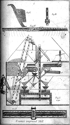 In 1787 Oliver Evans advertised on a broadside his mill in Delaware. This drawing above accompaned that handbill. It is the origin of the Young Mill-Wright & Miller's Guide, by Oliver Evans published in 1795. The illustration was originally entitled "Evans' improved Grist Mill."