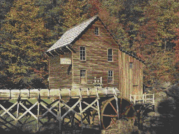 A cannibalized mill constructed from mill parts from 3 grist mills. The mill was created by combining parts and pieces from several old mills which once dotted West Virginia. Cooper's Mill operated on Glade Creek long before Babcock became a state park. The basic structure of the mill came from the Stoney Creek Grist Mill which dates back to 1890 and was dismantled and moved piece by piece to Babcock State Park. The mill has a Fitz Water Wheel but the water is applied too far forward on the water wheel, and a lot of power is wasted.