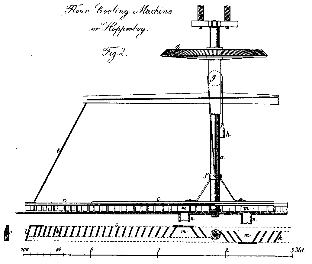 The Hopper-Boy, drawing (The Flour Cooling Machine or Hopper-Boy, Figure 2) from: Kick, Friedrich, "Flour Manufacture, A Treatise of Milling Science and Practice," second English edition 1888, first German edition 1871, London, Crosby Lockwood and Son, 1888. The hopper-boy is mentioned in many of Henry Pallett's articles found in The Miller's, Millwright's and Engineer's Guide.