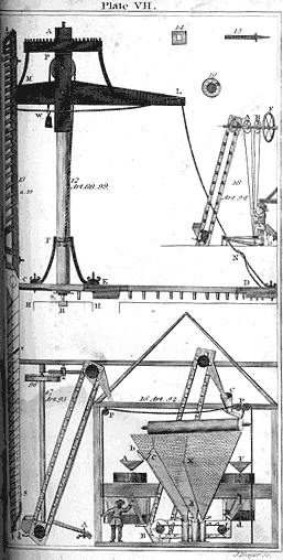 Fig. 12, Plate VII., is a hopper-boy; which consists of a perpendicular shaft, A B having a slow motion, (not above 4 revolutions in a minute,) carrying round with it the horizontal piece C D, which is called the arm; this, on the under side, is set full of small inclining boards, called flights, so as to gather the meal towards the centre, or to spread it from the center to that part of the arm which passes over the bolting hopper; at this part, one board is set broadside foremost, as E, (called the sweeper,) which drives the meal before it, and drops it into the hoppers H H, as the arms pass over them. The meal is generally let fall from the elevator, at the extremity of the arm, at D, where there is a sweeper, which drives the meal before it, trailing it in a circle the whole way round, so as to discharge nearly the whold of itsload, by the time it returns to be loaded again: the flights then gather it towards the centre, from every part of the circle; which would not be the case, if the sweepers did not lay it round; but the meal would, in this case, be gathered from one side only of the circle. These sweepers are screwed on the back of the arm, so that they may be raised or lowered, in order to make them discharge sooner or later, as may be found necessary. The extreme flight at each end of the arms is put on with a screw, passing through its centre, so that they may be turned to drive the meal outwards; the use of which is, to spread the war, meal as it falls from the elevator, in a ring, round the hopper-boy, while it, at the same time gathers, the cooled meal into the bolting hopper; so that the cold meal may be bolted, and the warm meal spread to cool, by the same machine, at the same time, if the miller chooses so to do. The foremost edge of the arm is sloped up in order to make it rise over the meal, and its weight is nearly balanced by the weight w, hung to one end of a cord, passing over the pulley P, and to the stay iron F. About 4 1/2 feet of the lower end of the upright shaft is made round, passing loosely through a round hole in the floght arm, giving it liberty to rise and fall freely, to suit any quantity of meal under it. The flight arm is led round by the leading arm L M, there being a cord passed through the holes L M, at each end, and made fast to the flight D C. This cord is lengthened or shortened by a hitch stick N, with two holes for the cord to pass through its end being passed through a hole at D, and fastened to the end of a stick; this cordmust reeve freely through the holes at the end of the arms, in order that the ends may both be led equally. The flight arm falls behind the leader about 1-6th part of the circle. The stay-iron C F E, is formed into a ringat F, which fits the shaft loosely, keeps the arm steady, and serves for hanging the hands of an equal height, by mean of the screws C E. Fig. 13, Plate VII., is a perspective view of the under side of the flight arms. The arm a c, with flights and sweepers complete; s s s show the screws which fasten the sweeper to the arms. The arm c b, is to show the rule for laying out for the flights. When the sweeper at b is turned in the osition of the dotted line; it drives the meal outwards. Fig. 14, Plate VII., represents a plate of metal on the bottom of the shaft, to keep the arm from the floor, and 15 is the step gudgeon.
