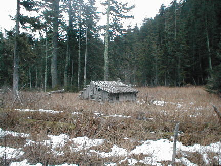 Pitcher Peak, 5933', December 25, 2004. Back again. There is virtually no snow. I was able to drive the access road to the start of off road travel and it was open to the parking area at the road's end. The summit too was almost snow free with just a foot or so on the windward slopes. For the first time I found the normally snow covered summit register. There appears to be some route finding problems. The key is to do what Beckey says but as you head up tward the notch as stated, when faced with a choice of left or right drainage forks, take the right. The objective notch really doesn't appear like one from below. it is a tight little spot where the wooded shoulder of Pitcher meets the lower, nerly horizontal, ridge. Once at the notch, anything that keeps below the rock outcroppings till a viable up route will work. It is mostly open forest. This picture is of the McGilvery cabin.