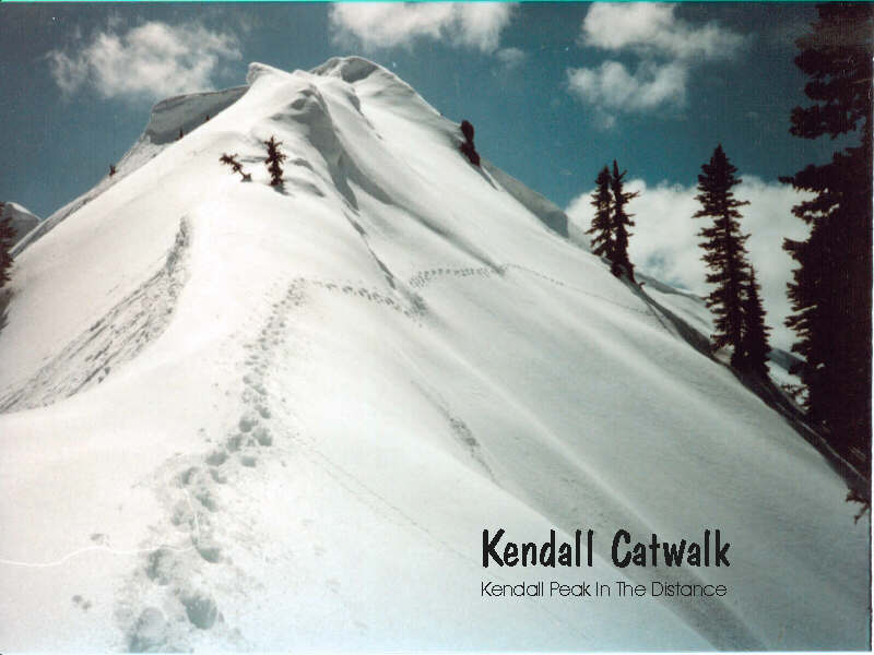 Kendall Catwalk PCT Snoqualmie Pass. April 28, 2002. Spring is here but there is still plenty of snow in the mountains. The Commonwealth parking lot is unplowed and soft snow makes snowshoes desirable almost immediately. The ski slopes have no skiers and there are few, as yet, hiker/snowshowers for the spring. Most tracks take off willy nilly from the parking lot and you need to take your own or be prepared to deviate from the normal PCT. The exposed slopes under Kendall Peak have much snow and several layers of crust which is quite stable for individuals or small groups but larger groups might do well to stay high to avoid avalanche danger. The catwalk itself is under much corniced snow. On this date, the warm sun and clear skies showed off all the neighboring peaks in high contrast to the blue skies. The original intent was to take the alternative route mentioned by Beckey from just beyond the catwalk then along the ridge to Red Mountain. It should be noted that, at least from a distance, there appears to be an erosion in the ridge that leaves a sheer 40'+ wall along the ridge and following down the south side into an active avalanche chute. This should be checked out in summer before trying a winter ascent of Red by this route. The solitude of the area now is sharp contrast to the summer hordes that will be there in a month or two.