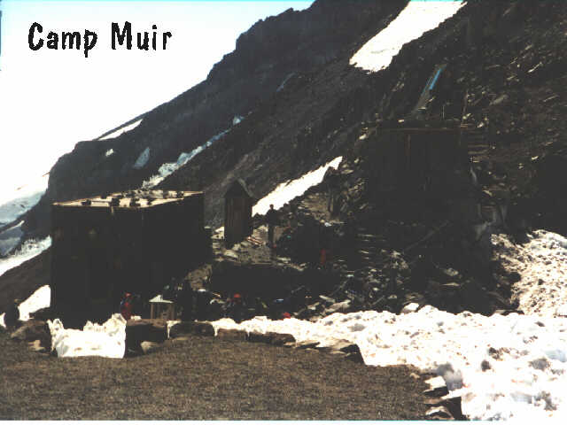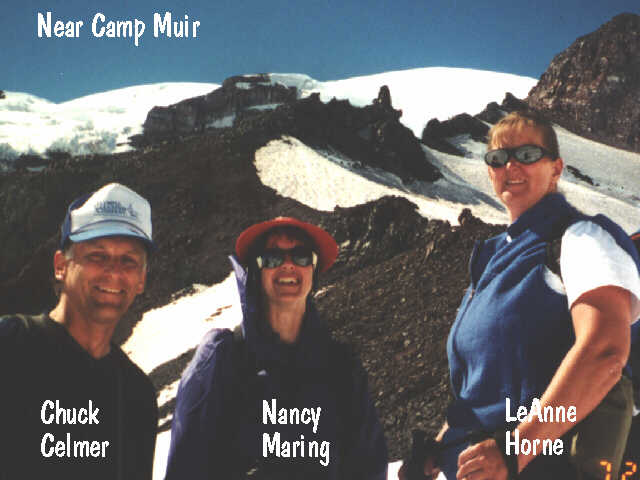 Camp Muir- Mount Rainier (c 10000') July 22,2000. Mike Calder, Nancy Maring, LeAnne Horne. This is the tourist version of climbing the mountain. Camp Muir is located on a ridge extension of Gibralter Rock which separates the Nisqually and Ingraham glaciers. Ascent is directly from paradise on trails to about Pebble Creek in mid summer and the balance on perpetual snow of the Muir snowfield the rest of the way. It is a continual upward pull taking 4-7 hours. There are no technical demands her but one should always exercise good judgement and caution when traveling this high on The Mountain. Although not a glacier, some smaller crevassing occurrs when there is extensive melting in some of the later parts of summer, depending on the year. BE CAREFUL OF THE WEATHER. Weather changes quickly and sometimes dramatically on the mountain and can become life threatening if not taken seriously. Post outing: Weather strikes again. The snow was in excellent condition. Steps were solid throught. The overcast of the Paradise parking lot opened up to nearly cloudless upperlevel skies in late afternoon. The areas below moon rocks deteriorated and by late afternoon were at near whiteout. Take extra equipment. We noticed several hikers who were dangerously ill-prepared, starting out for Muir too late in the evening with no backup plan and hiking/snowboarding alone. Great job Nancy and LeAnne on your first trip up the snow field.