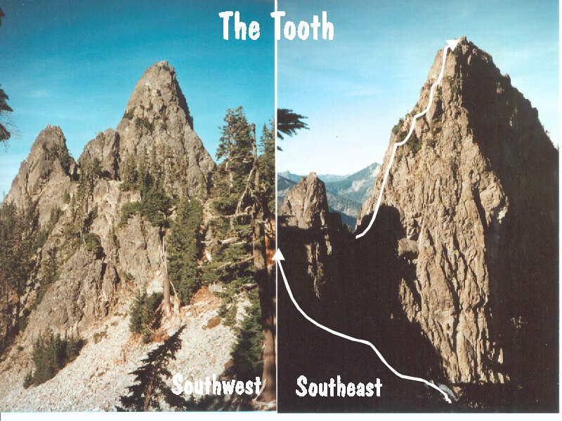 The Tooth (5604') South Face May 12, 2001 Nancy Maring, Mike Calder, Wayne Parslow. On the ridge line connecting Denny Mt on the south and Chair Peak on the north, the tooth is a pinacle that, in it's day was a substantial undertaking. With todays equipment and techniques the climb is a pleasant sport route which sees heavy trafic during the spring through fall seasons. Approach from Alpental/Source Lake then up the basin on the east side of the Tooth. Ascend a gulley on south of a small pinacle south of the Tooth proper then circle back around it's southwest side to Pineapple Pass and the start of the route. Straight forward routefinding and low class five climbing to the top. Take a map of the area to enjoy spotting yourself among the familiar peaks of the area. Post outing: There is still substantial snow in the east side basin and approach trail. All the talus is covered and glissading the descent is a joy. American Alpine Club was holding a climbing class here both Friday and Saturday of this week and also next. Expect LONG waits if you are not first on the rock. Hearing commands is extremely difficult here when the winds pick up. Suggest shorter pitches or run out the whole 60m of rope to avoid placing belay station directly under vertical wall below scrub trees.