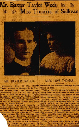 They went out to Oklahoma, a new state, my hopeful grandparents. There would be three sons: James Patton, Baxter, Jr., and my father, Robert Love, all born in Atoka, Oklahoma. A nephew of two of Tennessee's most memorable governors, Robert Love Taylor and Alfred Alexander Taylor, Baxter worked as a newspaper editor, and in 1910 was elected county judge. Then it was time to move on to higher things, for he was from a family keen on politics, and he moved his young family to Oklahoma City, where, in 1917, the politics were heating up.