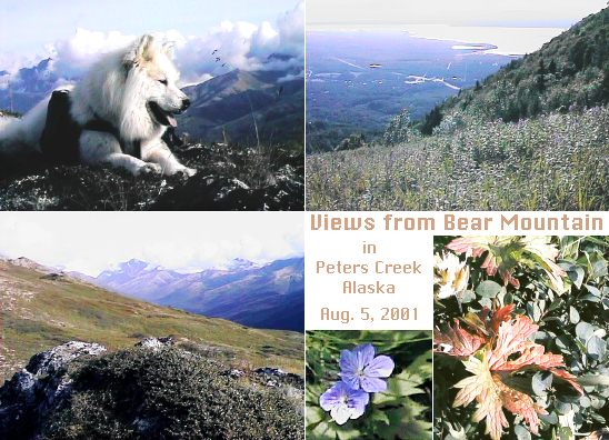The mountains are starting to show their fall colors now, so I'm trying to get up in them as much as I can before the snow makes them too dangerous. I wasn't really thinking about how Bear Point got its name until I happened upon some bear scat on the trail up there. Jascha bristled at the sight and went into full alert mode. He stood on tippytoe and sniffed the air intently in all directions. Then he relaxed and went on trotting the trail, which I took to mean, "No bears here now." He could have been lying to me, but we didn't encounter any bears. Jascha was a big help pulling me up the muddy trail. His inclination to pull does get a little scary on the way down however. (There was that one time on Bird Ridge when he had me airborne, a la SuperWoman, but I've let bygones be bygones.) From the alpine tundra on the top of Bear Mt., there were great views of Peters Creek, Knik Arm, Mirror Lake, and other peaks in the Chugach range. The summer tundra flowers were few and far between up there, and are being replaced with fall foliage colors. |