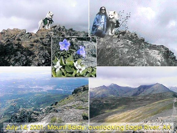 | It was cloudy in the mountains, but it didn't rain. We had a really nice climb, with beautiful views all along the way. As usual, the alpine tundra was covered with colorful little flowers that grow out of the rock. And Jascha alway enjoys seeing the ground squirrels that live in the mountains. There weren't very many people climbing Mt. Baldy today. One of the climbers was a big dog, a malamute, that seemed to be all by himself. He came running up the trail and attacked Jascha! Then he seemed very surprised to discover that Jascha was larger and perfectly willing to defend himself. So the malamute abruptly stopped fighting, and continued to run up the trail. By the time we got up to the summit, the other dog was gone, maybe down the other side. Jascha wasn't hurt, and he seemed to be proud of himself. Doesn't he look majestic in that upper left photo? |