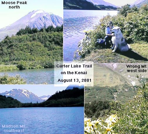 | We camped overnight about 30 miles from Seward, at the Carter Lake trailhead, and hiked that trail the next day. It was a very nice climb of about 1000', over 2.5 miles or so. The lake was very beautiful, nestled into a pass, surrounded by mountaintops. |