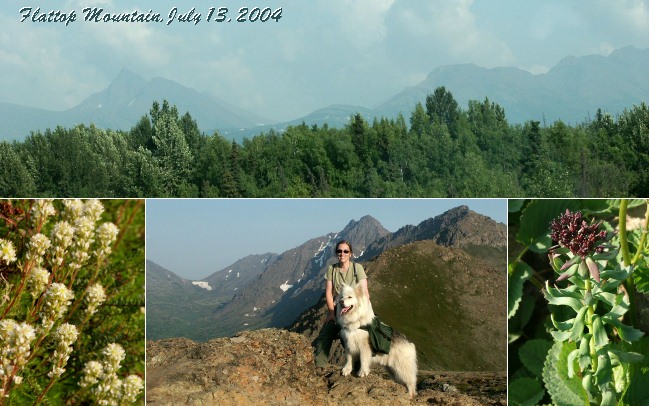 | There was a heavy haze in the air, composed of moisture from the sea and smoke from wildfires to the north, which made the nearby Chugach Mountains look very distant. But visibility was certainly much better than the last time we climbed the mountain. In the panorama (below), you can see the view from the city, with Flattop on the right side of the picture. In spite of the hot, muggy conditions, it was a lovely hike, and scores of hikers seemed to agree. The whole mountain was festooned with flowers. In the collage, you can see Alpine Spiraea in the lower left corner and King's Crown, lower right. |