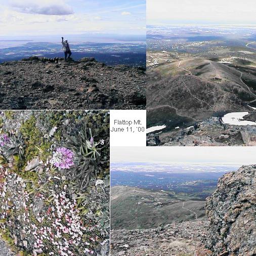 | Flattop Mountain, just outside Anchorage, is a popular climbing experience for Anchorage residents and visitors alike. Although I have lived in Alaska since 1971 and Anchorage since 1985, this was my first time up the trail. I was surprised at how difficult it was. The trail was snow-covered in several sections, and the rock climb at the top was especially terrifying because of snow and slippery conditions on the wet boulders. At the summit, the wind was powerful, and I was very thankful for the windbreaks made of piled rocks. I sat in a windbreak for awhile, eating a snack and chatting with other climbers, before heading down. Some more adventuresome sorts leapt off the cliff into a long snow chute to slide about a third of the way down, but I slowly picked my way along the path that took me to the top. The whole climb took me 4 hours. (Before I climb anything else, I will purchase some hiking boots.) |
