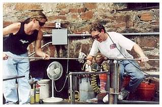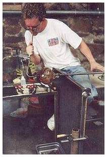 Artist-glassmaker David Hopman recently returned to California's Sierra Foothills after many years in the San Francisco Bay Area. A graduate in zoology from U.C. Davis he was working at Stanford when he focused his artistic interest on glass. Several years ago he began studying glassblowing at San Jose State. In 2000 he decided to devote full time to his art. As a zoologist and avid scuba diver he is strongly influenced by the natural world. It inspires the colors and patterns he utilizes in the classic and freeform blown shapes he creates. Using a state of the art electric furnace he melts glass batch brought in from the Netherlands. He then adds colors that come from as far away as New Zealand. Working the glass at over 2200 degrees, he blows and hand shapes the piece to achieve a wide array of forms. Many of the color patterns he has devised depend on complex and ever variable interactions between the compounds used in the different color stocks. His work is presently showing in nine Northern California galleries. David has participated in both juried and open exhibitions and recently had over one-hundred pieces as the only glassmaker in a two artist show. | |