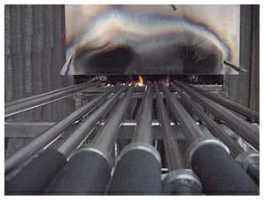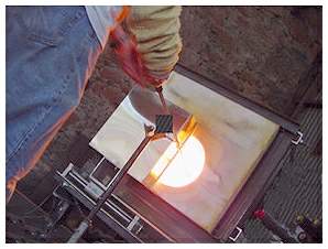 The studio utilizes a 200 pound Electroglass electric furnace and one Electroglass electric glory hole. Pipes and punties are from Cutting Edge (except when homemade). The marver is on a hydraulic car jack and can be raised or lowered according to need. The annealer was built by Tom Ash. | |