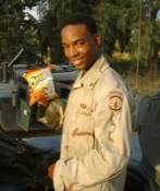 SPC Jefferson |  Holding up a bag of morale boosting Cheetos. |  SPC Jefferson and his team. |
