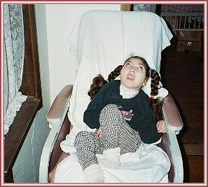 Alissa Marie Ginderwas born July 5,1992 and adopted. Alissa was approved for placement with our family in April 1999 and finally was able to join us in September 1999. She is a precious little girl that was born much too early. She was a twin but the other infant did not survive. She also has a very serious heart condition called hytrophy cardiomyopathy for which she takes medication. There was severe brain damage as well. Alissa is blind. She has a trach, a G-tube for medications and a J-tube for feedings. She has seizures as well. She has a very nice pink wheel chair and loves music. Alissa looks just like an American Indian maiden with her thick black hair and high cheek bones.