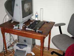 The next picture is of my 'workstation.' This is my new toy, since getting it I find myself sleeping less and less. I used to have a ThinkPad and not to be a switcher ad but that stopped working altogether and now I have a super stable operating system! Along with a new digital camera I managed to annex from my father.