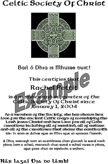 This is only an example of the 8.5x11in. or 216x279mm. certificate that comes with all donation levels. The Certificate is printed on high quality paper and everything is centered. Translation of the Gaelic is provided with every certificate.