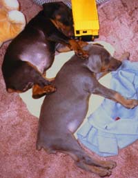 These two sleeping puppies are Hapi & Bambie. Of course you know which one is Bambie.(The fawn one.) You know the most famous fawn in the world!!! The red one is Hapi. I know, you are wondering why the weird spelling (I know, weird things from weird people.) But seriously, his name is Egyptian. Hapi was one of the four sons of Horus and Isis who guarded the lungs and was portrayed as dog-headed.