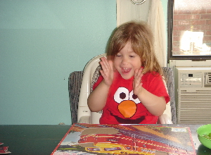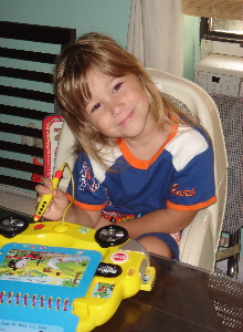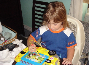 6/13/06 - Playing with her Leap pad, wearing her new favorite Cars pj's.