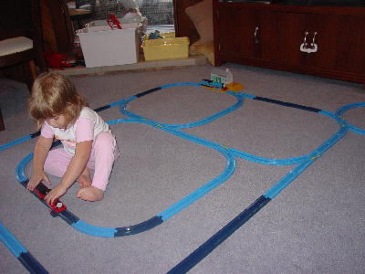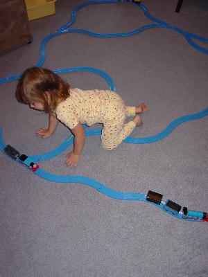 02/27/05 - John brought home a new toy for Kaira one day recently - a Thomas electric train. Of course we had to get a track to run him on, and the collection quickly grew. She now has 2 Thomas' and a James engine, and the tracks that came with the kits, complete with train station. The only problem with multiple trains on one track - frequent collisions, but I guess that's part of the fun. This has been a recent favorite.