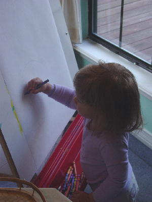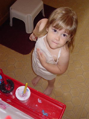 04/15/05 - Kaira and I recently got easels (thank you Grammy and GiGi!), and have had a good time playing with the paint. I even found her a smock that looks just like Mommy's - very cute.
